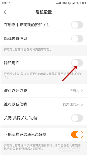 打开后可看到【隐私用户】后方的状态为橘黄色,这是开启的标志。