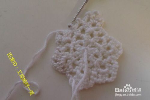 第四圈:第一个花样钩织好后,下面再拉2个辫子针,在第一个长针上钩织一个短针,拉3个辫子针,返回在第一针做引拔连接,然后再拉2个辫子针,在上一圈3辫子针形成的洞洞里钩织一个短针,再拉3个辫子针,返回在第一针做引拔连接,在3辫子针形成的洞洞里钩织一个短针,再拉5个辫子针,返回在第一针做引拔连接,然后还是在洞洞里钩一个短针,再拉3个辫子针,返回在第一针做引拔连接,然后再拉2个辫子针,在长针上钩织一个短针,再拉3个辫子针,返回在第一针做引拔连接,再拉2个辫子,在上一圈短针的地方做引拔连接,这样就是第二个花样的钩织。下面的钩织都是参考第二个花样进行钩织,将余下的花样钩织完毕,最后一个短针钩织在第三圈的中长针上,与立的一针做引拔针连接,这样一片雪花就钩织好了。
