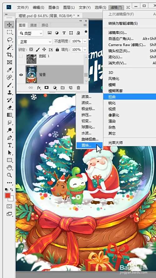 先隐藏褶皱的素材,然后点击背景图层,点击滤镜里的扭曲下的置换。