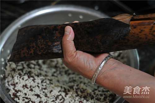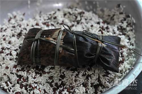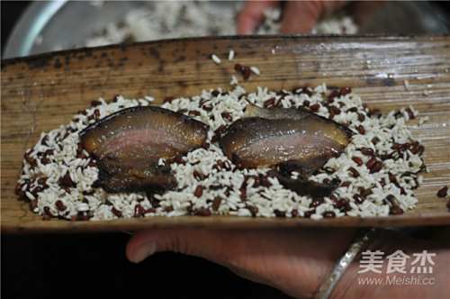 6舀一勺糯米红豆放在笋壳叶子中间,用手将米粒稍微弄平整