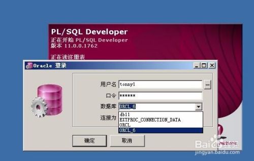 编辑完这个文件后保存,我们再次双击PL/SQL Developer程序,我们看到我们这个时候可以选择database,内容是我们上一个步骤设置的格式名。我们填写数据库上的用户名和密码,填写完成后我们点击“确定”。