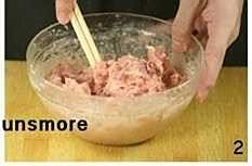 把黄油融化,倒入肉馅、打散的鸡蛋、面粉、料酒,顺同一个方向用力搅拌至上劲。
