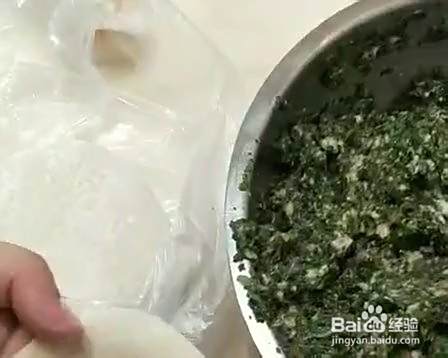 放入荠菜,搅啊搅,让肉把荠菜汁吸进去,搅匀,馅儿变稠就可以了