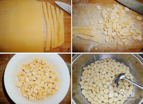 往小面块中洒少许淀粉,轻轻抖散以防粘连,锅内倒适量葵花籽油,烧至八成热时放入部分面块,边炸边搅动