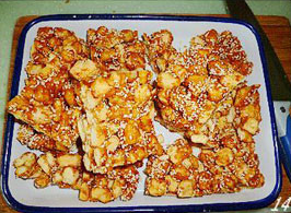 白糖熬至化开并起深黄色大泡时,倒进炸好的小面粒和熟芝麻,在锅内快速搅拌均匀后,倒入事先抹油的瓷盘内
