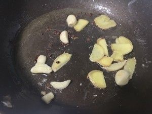 重新起油锅,加入姜片蒜瓣花椒粒爆出香味。