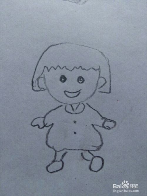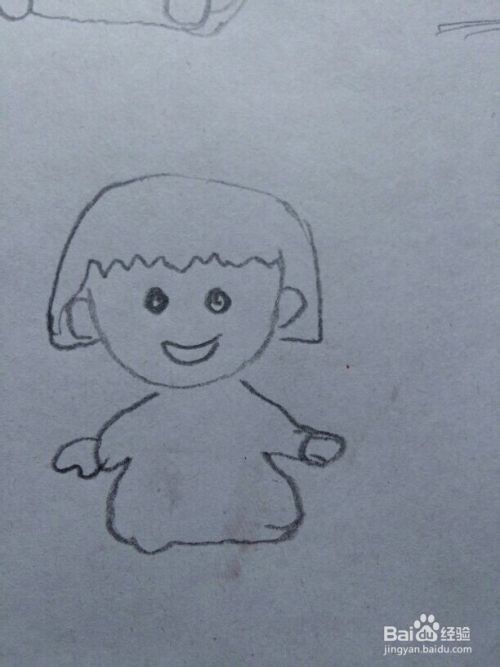 勾出上半身,注意双手的动作哦,因为是小女孩,所以它的服装也是有一些特点的。