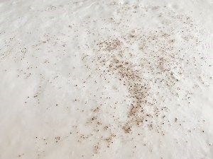 面粉倒进大一点的盆子里,一手拿筷子,一手将温水缓慢一点点的加入面粉中,边加水边将面粉搅拌成棉絮状,随后揉成团(此时面团不光滑,不要紧),从盆中取出,放在案板上。如图。