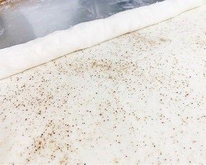 接下来就是将面片卷成卷状。这里又有一个小窍门,就是提起面片的一边,边向边上提拉,边卷。也就是提一下,卷一下。卷好后边缘捏紧,两头捏紧,防止漏油。
