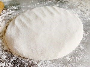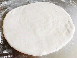 醒好后,将面团擀成适合锅子大小的圆形。(厚度约2个硬币,不建议擀太薄太薄,不然烙好后会干。)