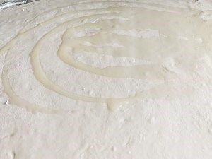 擀成大片以后,淋食用油,油量大约可以覆盖整张饼,(可以先少放,不够再加,多了就容易漏油)。接下来就是要将油均匀的涂抹在面片的每个角落,小窍门如下步