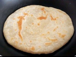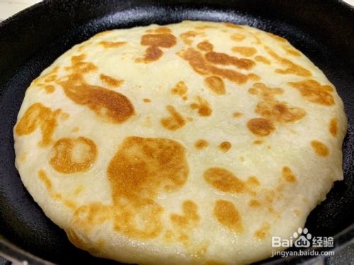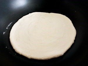 中小火热锅,锅热后,将擀好的饼胚放入,勤翻面(烙饼过程中,可以刷油也可以不刷油)
