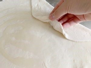 拎起面片的一角,折叠在有油的地方,蹭上油后,再放回去。如此反复,直到面片全部均匀的抹上油。(这种方法是家中常用的土方法,当然也可以用油刷)