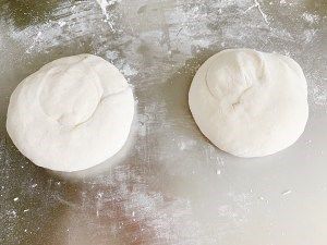将卷好的面一切为二,团成圆形,收口压在底下。稍微醒两分钟。(因为直接擀的话,会回缩)