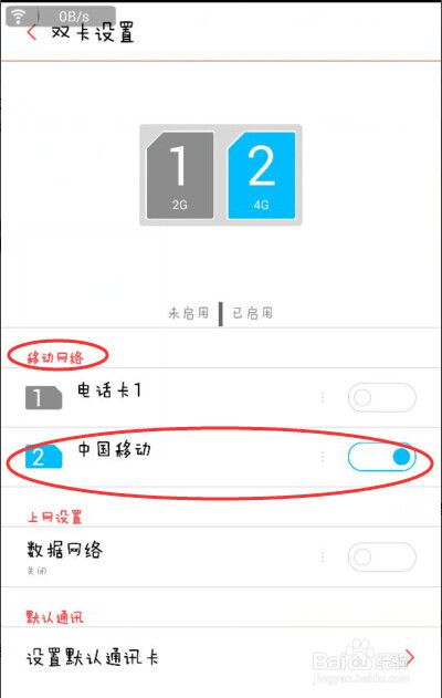 然后会看到显示我们已经插入的两张电话卡,我们选择移动卡这款手机只支持移动、联通4G