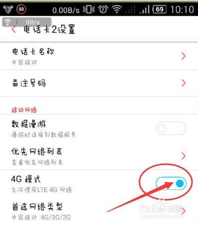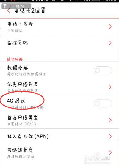点击移动之后,可以看到一些关于电话卡2显示的一些信息,我们可以看到一个允许4G模式的选项。