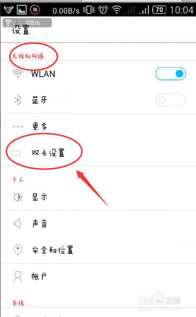 进入手机的系统设置页面后,会看到有很多选项,我们选择“无线和网络”选项下面的“双卡设置”选项