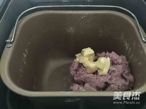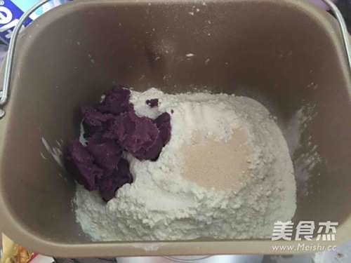 5接着放入高粉、酵母和90克紫薯泥,开始和面
