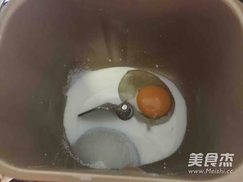 4先在面包桶里加入牛奶、鸡蛋、砂糖和盐