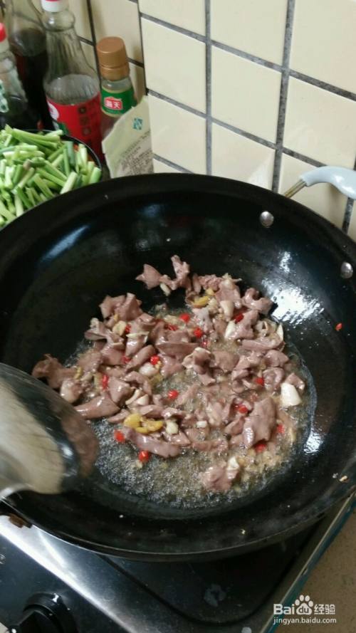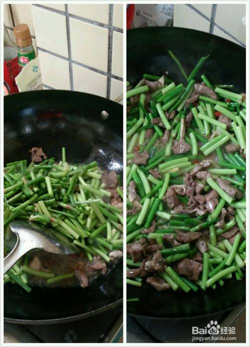 猪心五分熟,倒入蒜苗,加一小勺盐翻炒,炒至四五分钟,蒜苗变熟即可