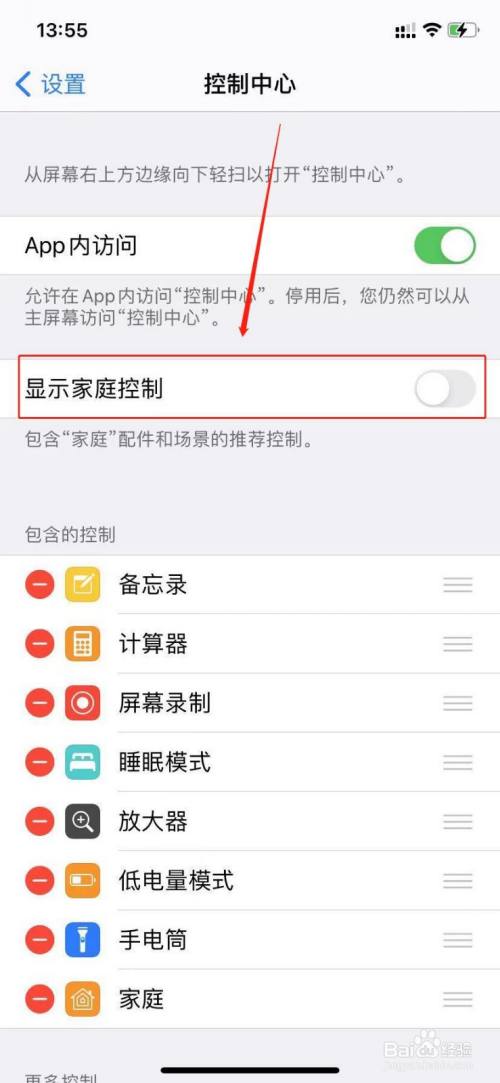 接着在打开的【控制中心】界面,点击将【显示家庭控制】右侧的按钮关闭。