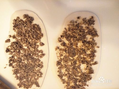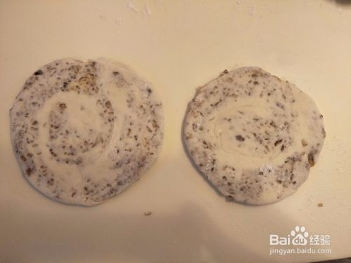 把面团擀开,在上面均匀的涂抹上核桃末,卷好竖着绕起来,放案上,按扁,擀成圆的饼坯