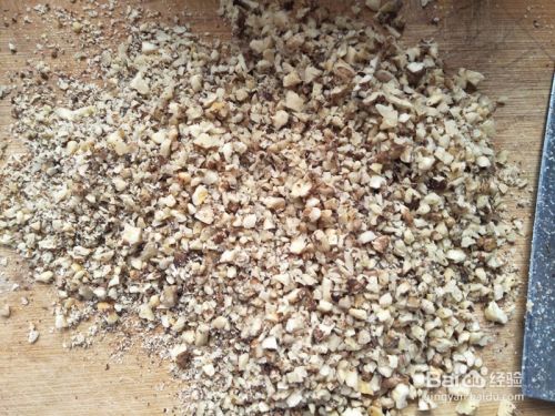 把烤好的核桃仁放在案板上,用刀剁成碎末