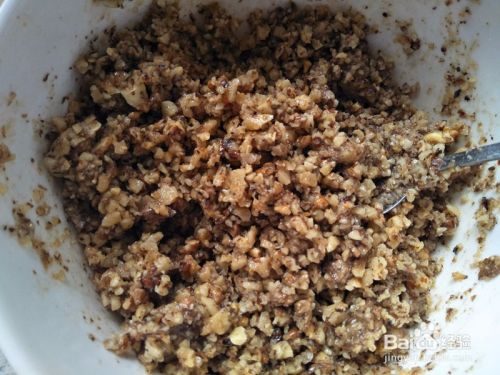 把剁好的核桃碎末放入一个大碗里,加入两勺芝麻酱,适量的食用盐和少许食用油均匀搅拌