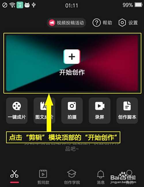 开始创作。在“剪辑”模块顶部,点击“开始创作”。