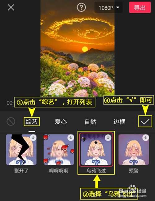 选择特效。点击“综艺”选项卡,打开特效列表,选择“乌鸦飞过”特效,点击列表右上角的“√”即可。