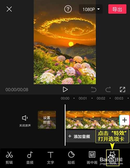 点击特效。点击底部工具栏中的“特效”,打开选项卡。