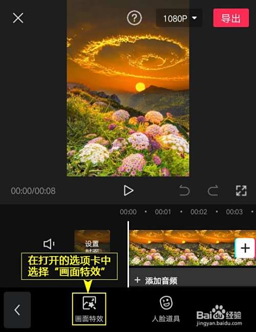 选择画面特效。在打开的底部选项卡中,选择“画面特效”。