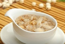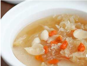 银耳(干)10克,百合(干)10克,粳米25克。银耳用水泡涨,百合、粳米洗净后同放入锅中,加水适量煮成粥,再加冰糖少许即可。