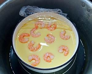 包上保鲜膜,水开煮7分钟;掀开保鲜膜再放上虾仁,继续煮个3分钟;