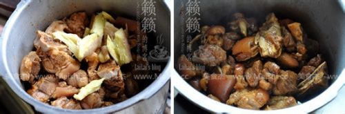 将生姜用刀背拍松拍碎,撒入锅中,最后再把高压锅内的食材颠拌一轮,锅中无需加入1滴水,直接扣上高压锅盖,插上气嘴