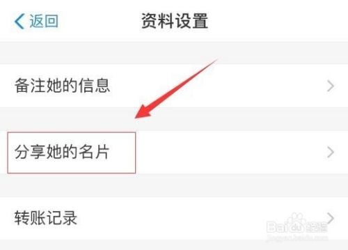 接着,在资料设置界面中,找到“分享他的名片”,选择“分享他的名片”。如图: