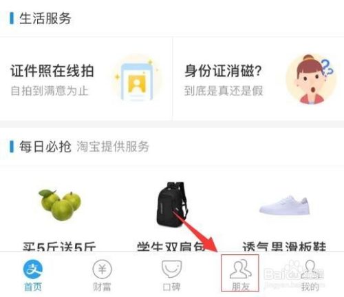 接着,进入支付宝,在支付宝下方的导航栏中找到“朋友”,点击进入。如图: