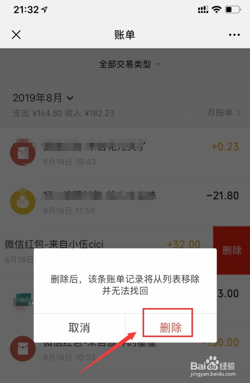 在弹出新界面,点击删除;同样的方法,将微信账单中的明细可以逐条删除。目前微信不支持批量删除,只能一条条进行删除;
