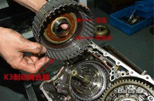 这是大众速腾09G变速箱内部的,K3制动离合器,这个速腾09G变速箱内部的K3制动离合器上有一组活塞和一组摩擦片,要把速腾09G变速箱内部的K3制动离合器拆解开,检查速腾09G变速箱的摩擦片和速腾09G变速箱的活塞,如果速腾09G变速箱的摩擦片出现烧坏的现象,就要更换全新的,改进的速腾09G变速箱的摩擦片。如果速腾09G内部的活塞出现老化破损的情况,就要更换全新的速腾09G变速箱改进的活塞。