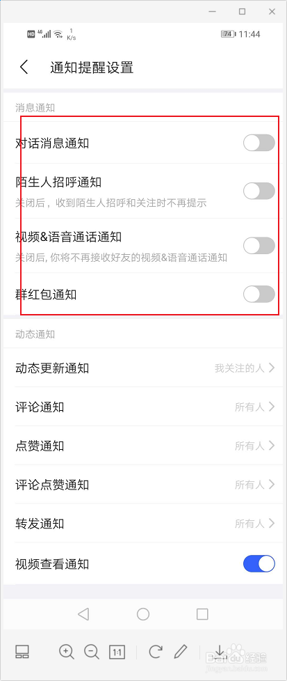 把通知提醒设置中的“消息通知”一栏全部设置为关闭状态,即可成功关闭消息通知了