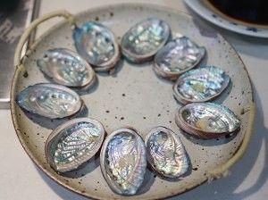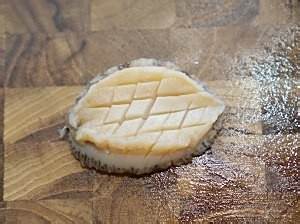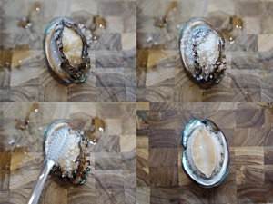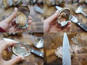 用勺子铲出鲍鱼肉,壳内的东西全部去除冲洗干净。鲍鱼肉头部也要去除。