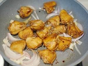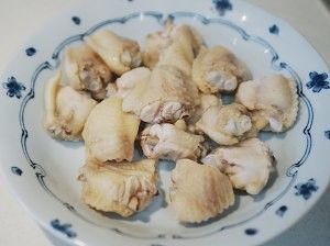 鸡翅对半剪开,锅中加一勺料酒焯水后捞出,控干水分。