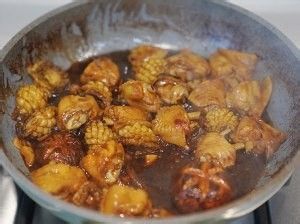 加少许热水,不需要完全淹没食材。中大火炖煮,无需盖锅盖。中途不停地翻动食材。