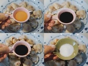 加入1勺料酒、1勺生抽、1勺老抽、1勺白糖和1勺蚝油。