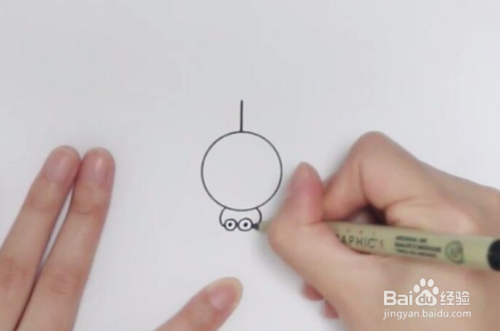 首先画一个大圆,再画一个椭圆,再画上两个圆形的眼睛和一条直线。