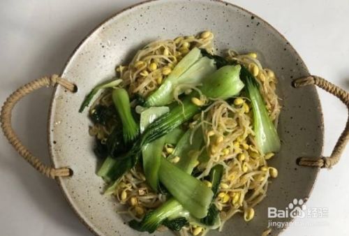 锅里放入少许清水,把豆芽与油菜下锅翻炒去生后盛出备用。将锅刷干净后放入油烧热,挤入豆瓣酱炒香至出油。