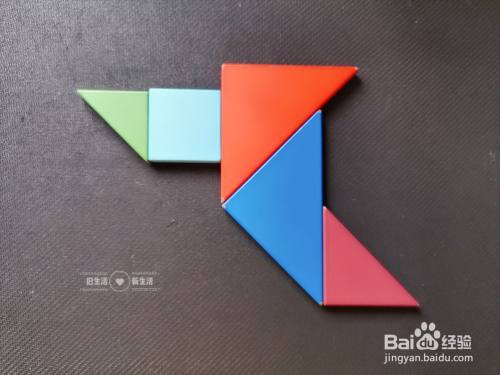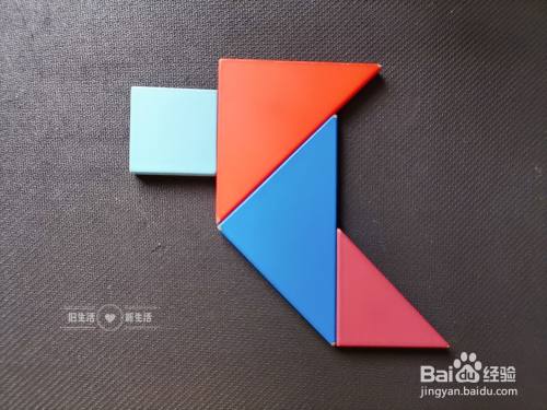 拿出一个天蓝色正方形放在红色大三角形的左边,如下图所示。