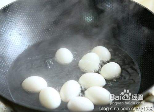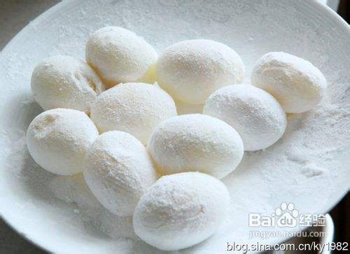 鸽子蛋放入锅中煮熟,剥壳后,将鸽子蛋放入淀粉中均匀滚过。