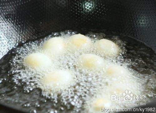 热锅放入适量的油烧热,放入滚过粉的鸽子蛋,炸至呈金黄色,捞出沥油备用。