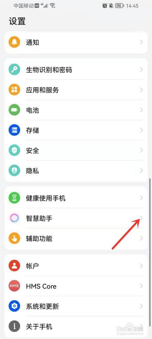 打开手机设置界面,下拉页面找到【智慧助手】,点击进入。